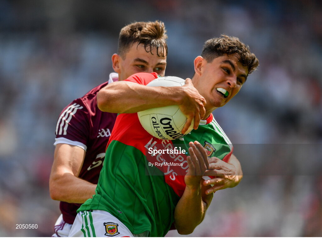 25 July 2021; Tommy Conroy of Mayo in action against Matthew Tierney of Galway during the Connacht GAA Senior Football Championship Final match between Galway and Mayo at Croke Park in Dublin. Photo by Ray McManus/Sportsfile