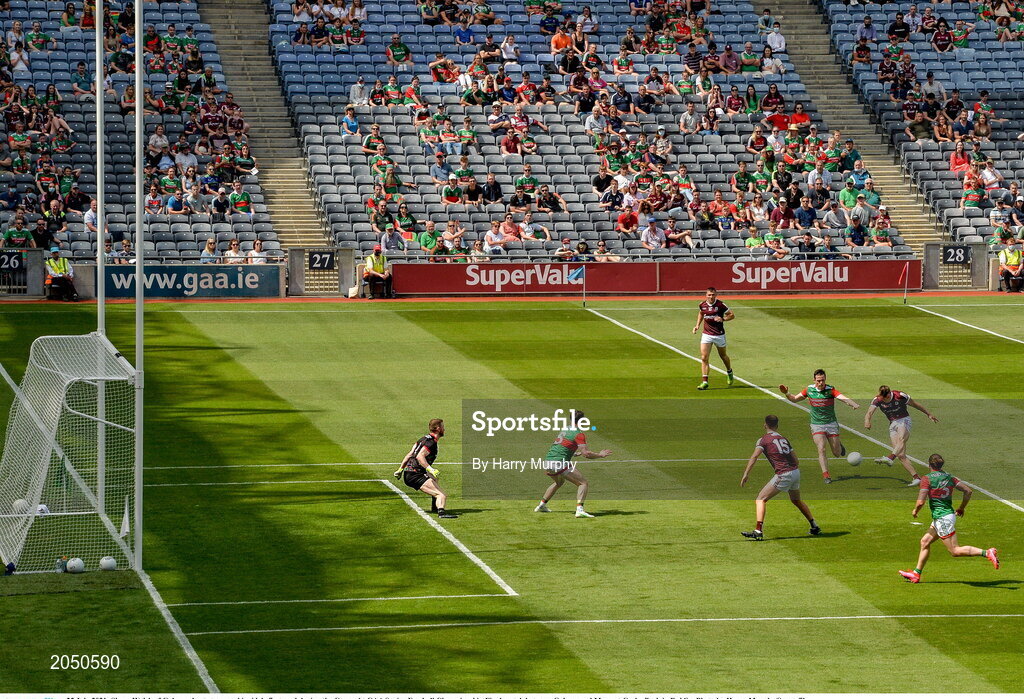 25 July 2021; Shane Walsh of Galway shoots to score his side's first goal during the Connacht GAA Senior Football Championship Final match between Galway and Mayo at Croke Park in Dublin. Photo by Harry Murphy/Sportsfile