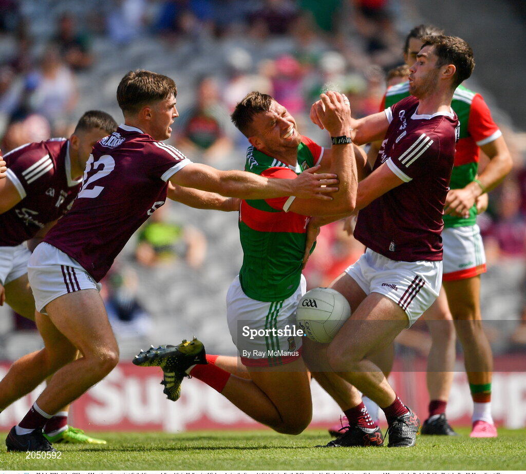 25 July 2021; Aidan O'Shea of Mayo in action against Cathal Sweeney, left, and Seán Mulkerrin of Galway during the Connacht GAA Senior Football Championship Final match between Galway and Mayo at Croke Park in Dublin. Photo by Ray McManus/Sportsfile