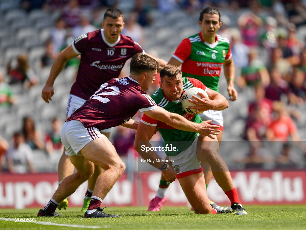 25 July 2021; Aidan O'Shea of Mayo in action against Cathal Sweeney of Galway during the Connacht GAA Senior Football Championship Final match between Galway and Mayo at Croke Park in Dublin. Photo by Ray McManus/Sportsfile