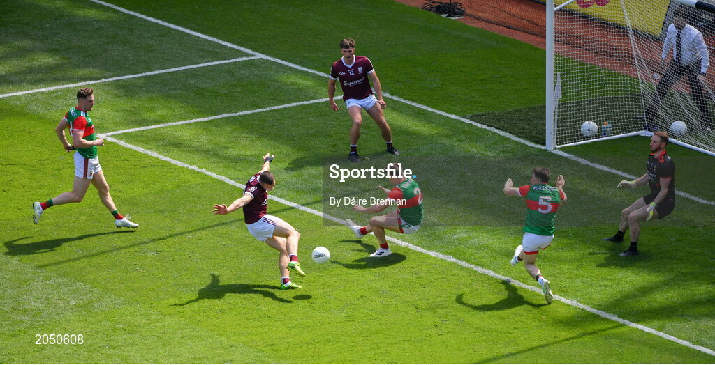 25 July 2021; Damien Comer of Galway scores his side's second goal past Rob Hennelly of Mayo during the Connacht GAA Senior Football Championship Final match between Galway and Mayo at Croke Park in Dublin. Photo by Daire Brennan/Sportsfile