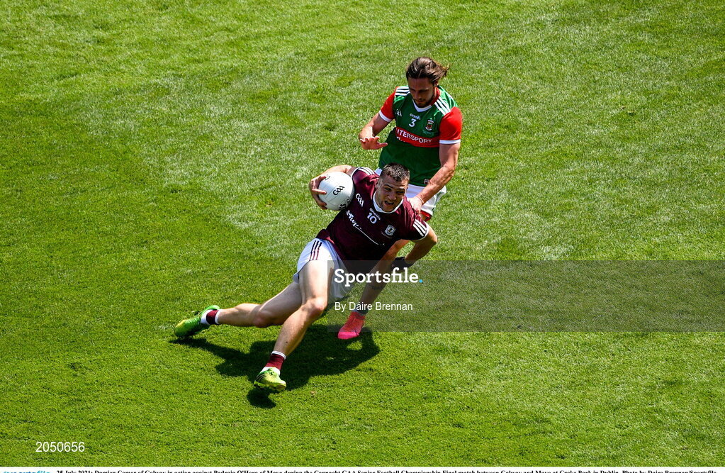 25 July 2021; Damien Comer of Galway in action against Padraig O'Hora of Mayo during the Connacht GAA Senior Football Championship Final match between Galway and Mayo at Croke Park in Dublin. Photo by Daire Brennan/Sportsfile