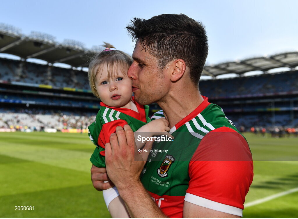 25 July 2021; Lee Keegan of Mayo celebrates with his daughter Líle, aged one, after the Connacht GAA Senior Football Championship Final match between Galway and Mayo at Croke Park in Dublin. Photo by Harry Murphy/Sportsfile