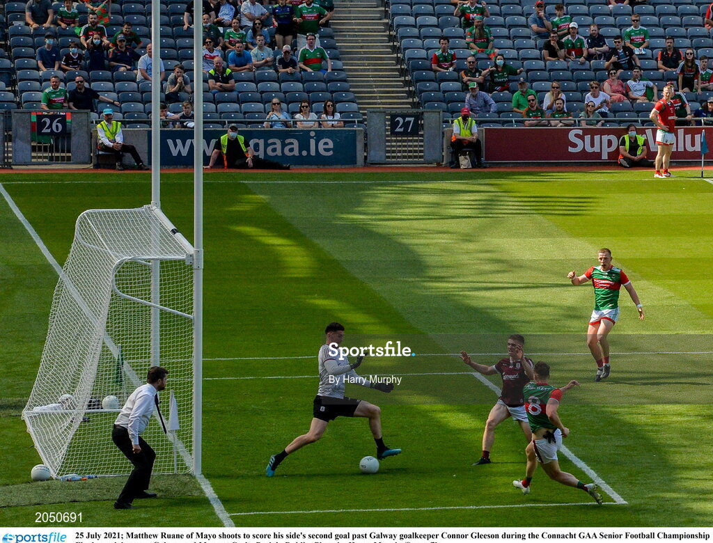 25 July 2021; Matthew Ruane of Mayo shoots to score his side's second goal past Galway goalkeeper Connor Gleeson during the Connacht GAA Senior Football Championship Final match between Galway and Mayo at Croke Park in Dublin. Photo by Harry Murphy/Sportsfile