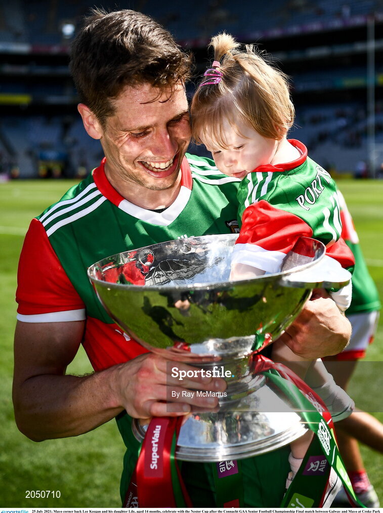 25 July 2021; Mayo corner back Lee Keegan and his daughter Líle, aged 14 months, celebrate with the Nestor Cup after the Connacht GAA Senior Football Championship Final match between Galway and Mayo at Croke Park in Dublin. Photo by Ray McManus/Sportsfile