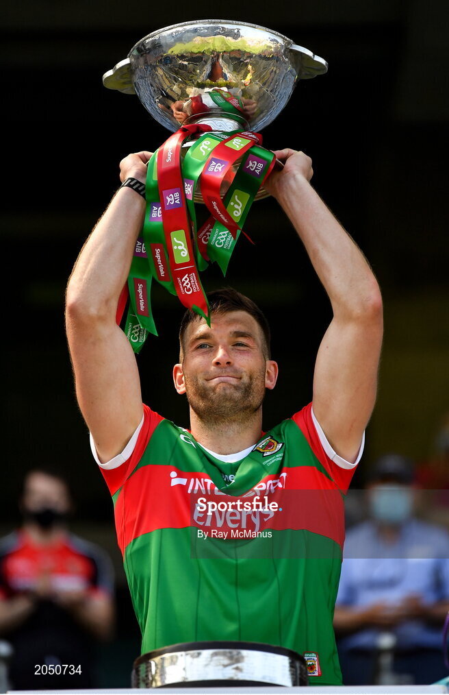 25 July 2021; Mayo captain Aidan O'Shea lifts the Nestor Cup after the Connacht GAA Senior Football Championship Final match between Galway and Mayo at Croke Park in Dublin. Photo by Ray McManus/Sportsfile