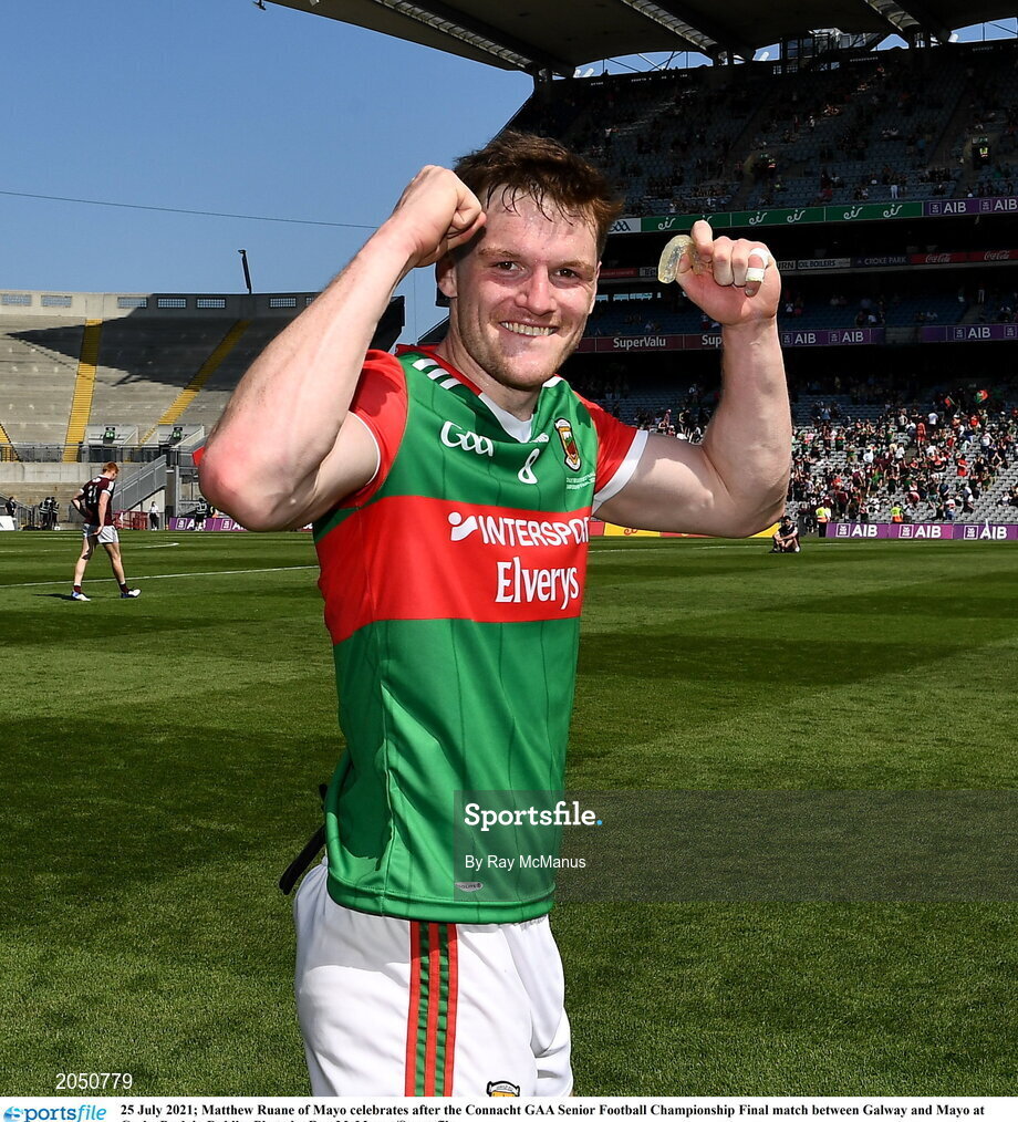 25 July 2021; Matthew Ruane of Mayo celebrates after the Connacht GAA Senior Football Championship Final match between Galway and Mayo at Croke Park in Dublin. Photo by Ray McManus/Sportsfile