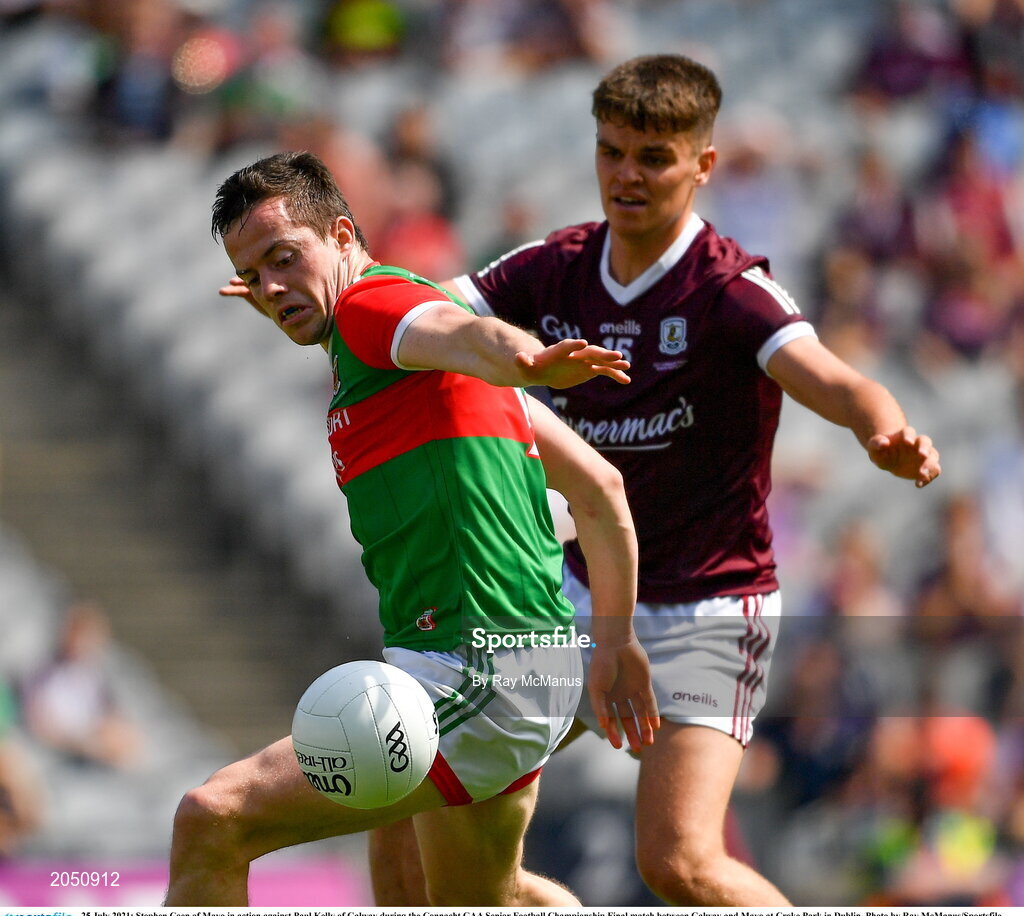 25 July 2021; Stephen Coen of Mayo in action against Paul Kelly of Galway during the Connacht GAA Senior Football Championship Final match between Galway and Mayo at Croke Park in Dublin. Photo by Ray McManus/Sportsfile