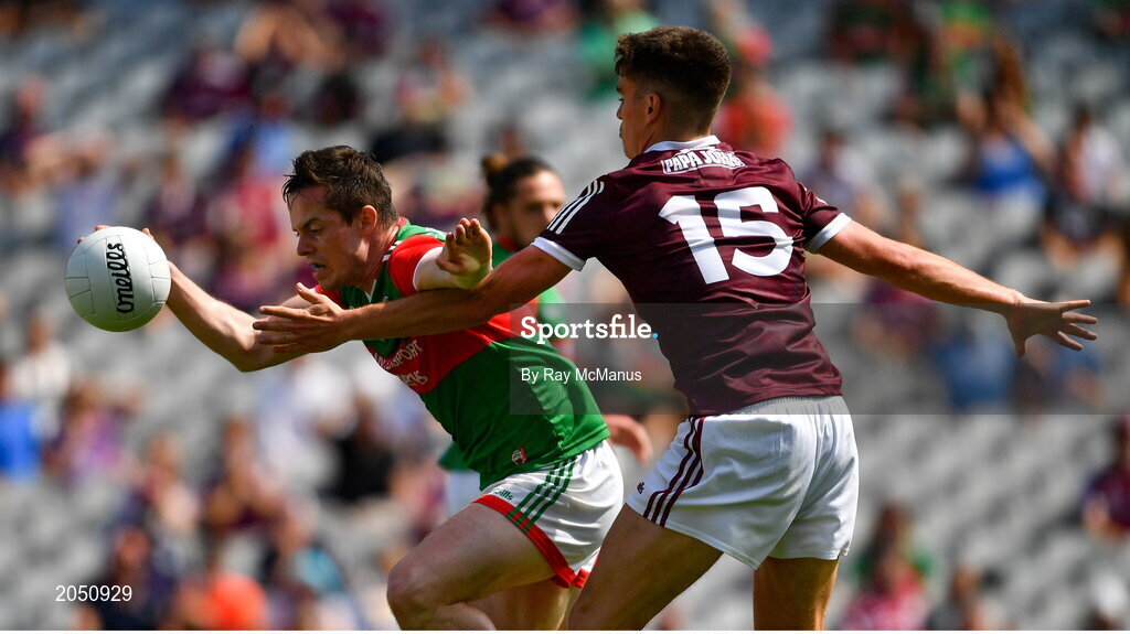 25 July 2021; Stephen Coen of Mayo in action against Paul Kelly of Galway during the Connacht GAA Senior Football Championship Final match between Galway and Mayo at Croke Park in Dublin. Photo by Ray McManus/Sportsfile