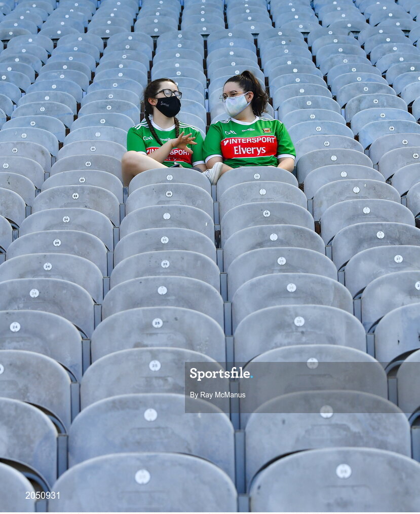 25 July 2021; Sisters Leah, left, and Cara Fahey, from Swinford, relax in the Cusack stand before the Connacht GAA Senior Football Championship Final match between Galway and Mayo at Croke Park in Dublin. Photo by Ray McManus/Sportsfile