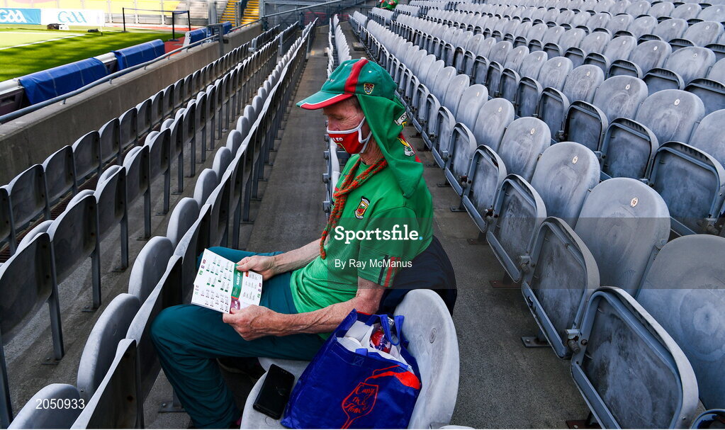 25 July 2021; Mayo supporter Seosamh Ó Maolchroim, from AghaGower, reaads his match programme before the Connacht GAA Senior Football Championship Final match between Galway and Mayo at Croke Park in Dublin. Photo by Ray McManus/Sportsfile