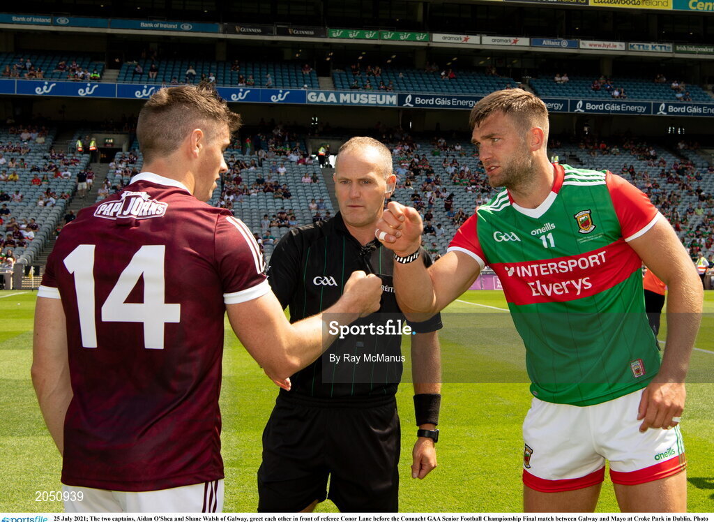 25 July 2021; The two captains, Aidan O'Shea and Shane Walsh of Galway, greet each other in front of referee Conor Lane before the Connacht GAA Senior Football Championship Final match between Galway and Mayo at Croke Park in Dublin. Photo by Ray McManus/Sportsfile
