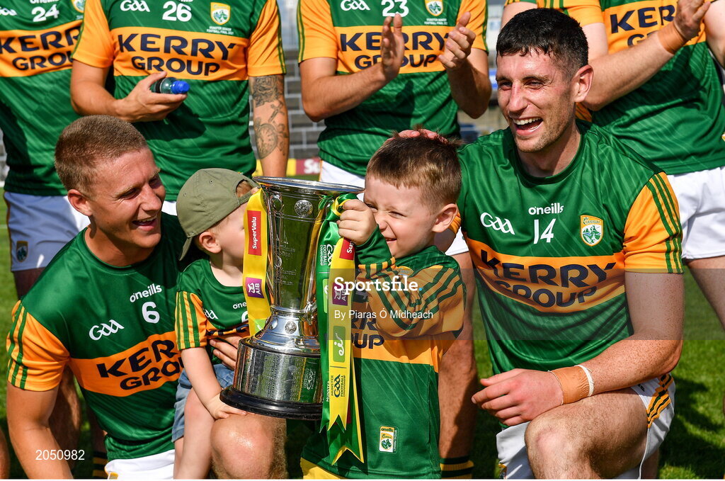 25 July 2021; Kerry footballer Paul Geaney and his son Paidi celebrate with the cup after the Munster GAA Football Senior Championship Final match between Kerry and Cork at Fitzgerald Stadium in Killarney, Kerry. Photo by Piaras Ó Mídheach/Sportsfile