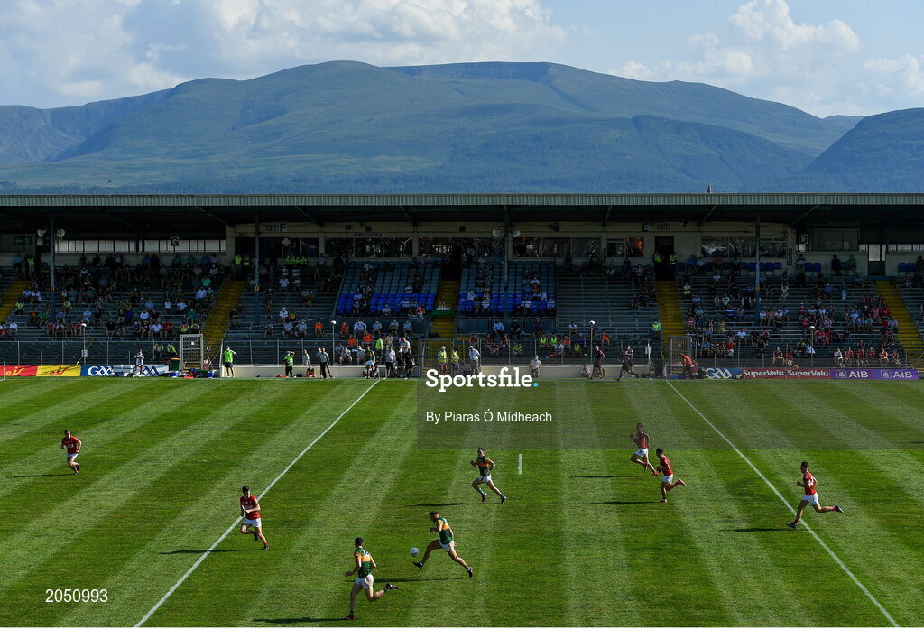 25 July 2021; Micheál Burns of Kerry makes his way up the pitch on a solo run during the Munster GAA Football Senior Championship Final match between Kerry and Cork at Fitzgerald Stadium in Killarney, Kerry. Photo by Piaras Ó Mídheach/Sportsfile