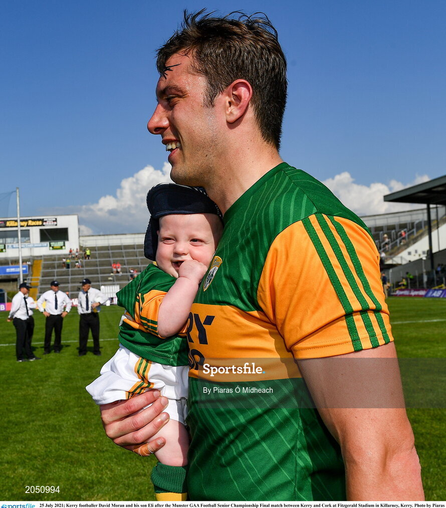 25 July 2021; Kerry footballer David Moran and his son Eli after the Munster GAA Football Senior Championship Final match between Kerry and Cork at Fitzgerald Stadium in Killarney, Kerry. Photo by Piaras Ó Mídheach/Sportsfile