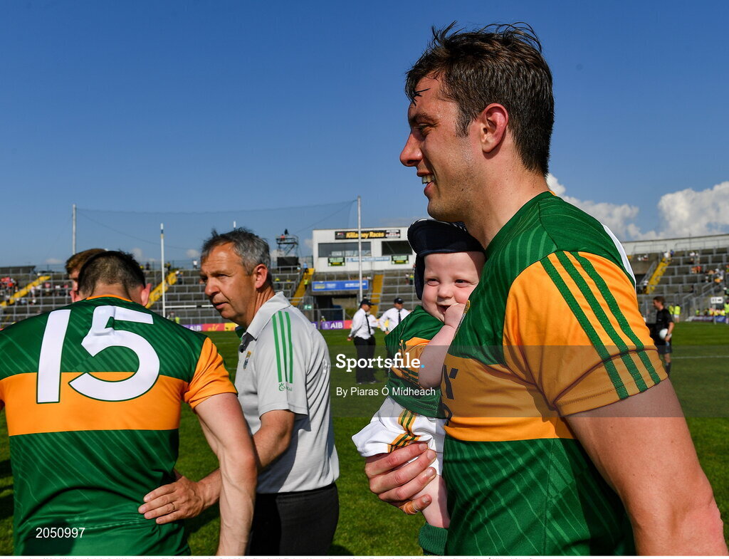 25 July 2021; Kerry footballer David Moran and his son Eli after the Munster GAA Football Senior Championship Final match between Kerry and Cork at Fitzgerald Stadium in Killarney, Kerry. Photo by Piaras Ó Mídheach/Sportsfile