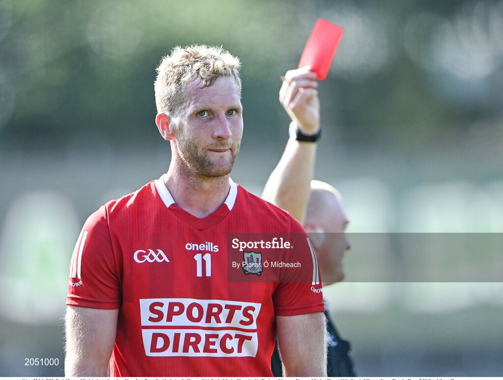 25 July 2021; Ruairí Deane of Cork is shown the red card by referee Barry Cassidy during the Munster GAA Football Senior Championship Final match between Kerry and Cork at Fitzgerald Stadium in Killarney, Kerry. Photo by Piaras Ó Mídheach/Sportsfile
