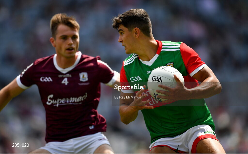 25 July 2021; Tommy Conroy of Mayo in action against Liam Silke of Galway during the Connacht GAA Senior Football Championship Final match between Galway and Mayo at Croke Park in Dublin. Photo by Ray McManus/Sportsfile