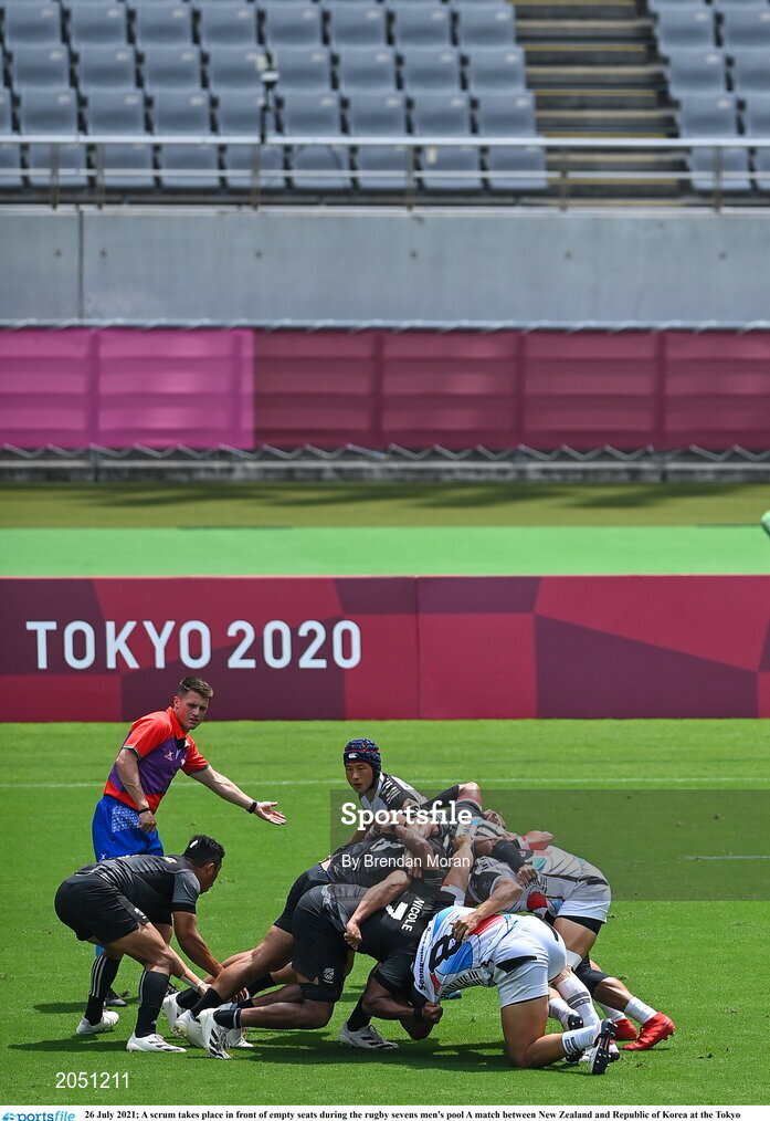 26 July 2021; A scrum takes place in front of empty seats during the rugby sevens men's pool A match between New Zealand and Republic of Korea at the Tokyo Stadium during the 2020 Tokyo Summer Olympic Games in Tokyo, Japan. Photo by Brendan Moran/Sportsfile
