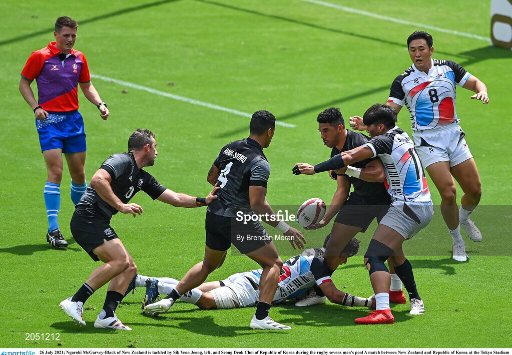 26 July 2021; Ngarohi McGarvey-Black of New Zealand is tackled by Sik Yeon Jeong, left, and Seong Deok Choi of Republic of Korea during the rugby sevens men's pool A match between New Zealand and Republic of Korea at the Tokyo Stadium during the 2020 Tokyo Summer Olympic Games in Tokyo, Japan. Photo by Brendan Moran/Sportsfile