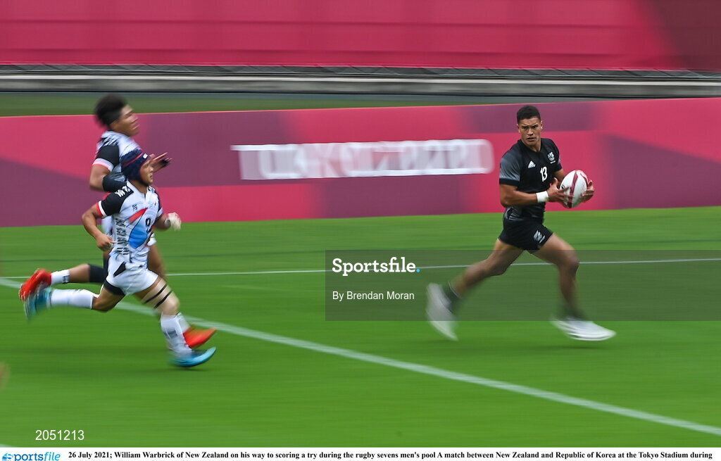 26 July 2021; William Warbrick of New Zealand on his way to scoring a try during the rugby sevens men's pool A match between New Zealand and Republic of Korea at the Tokyo Stadium during the 2020 Tokyo Summer Olympic Games in Tokyo, Japan. Photo by Brendan Moran/Sportsfile