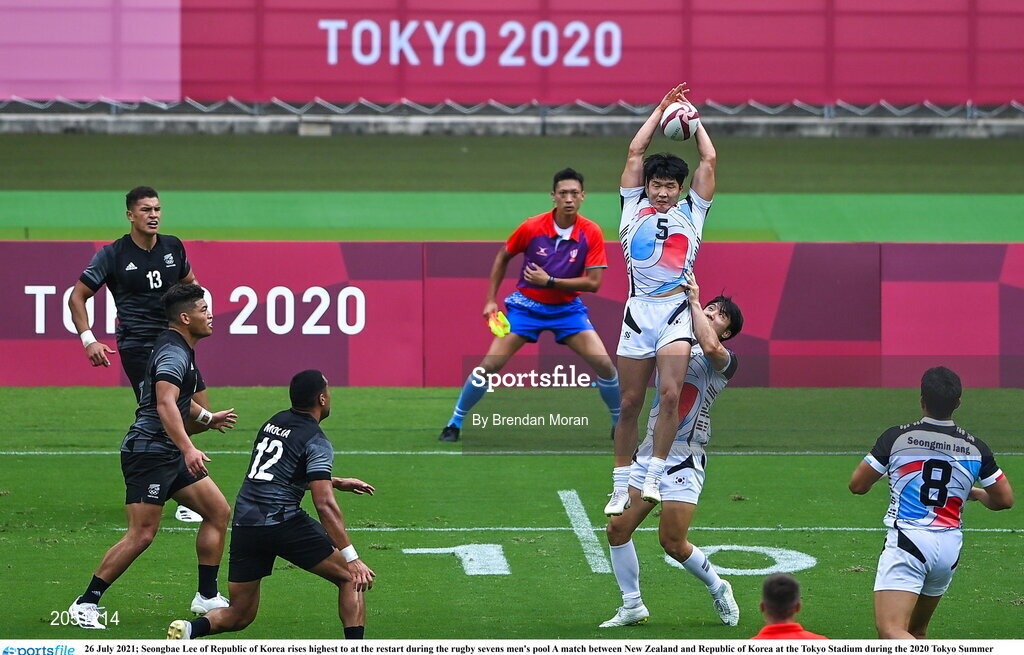 26 July 2021; Seongbae Lee of Republic of Korea rises highest to at the restart during the rugby sevens men's pool A match between New Zealand and Republic of Korea at the Tokyo Stadium during the 2020 Tokyo Summer Olympic Games in Tokyo, Japan. Photo by Brendan Moran/Sportsfile