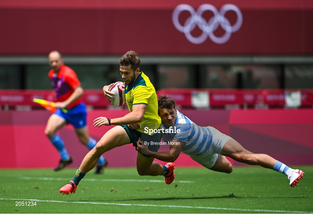 26 July 2021; Josh Turner of Australia scores his side's first try despite the tackle of Argentina's Luciano Gonzalez during the rugby sevens men's pool A match between Australia and Argentina at the Tokyo Stadium during the 2020 Tokyo Summer Olympic Games in Tokyo, Japan. Photo by Brendan Moran/Sportsfile