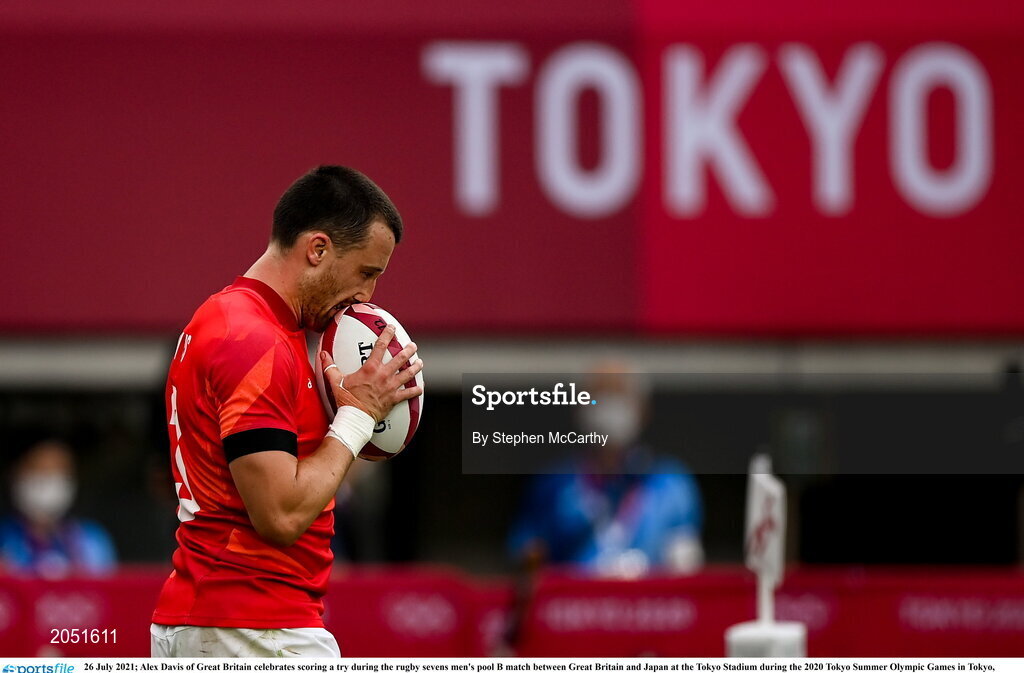 26 July 2021; Alex Davis of Great Britain celebrates scoring a try during the rugby sevens men's pool B match between Great Britain and Japan at the Tokyo Stadium during the 2020 Tokyo Summer Olympic Games in Tokyo, Japan. Photo by Stephen McCarthy/Sportsfile