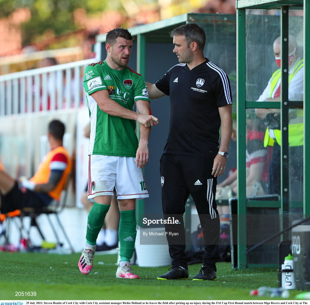 25 July 2021; Steven Beattie of Cork City with Cork City assistant manager Richie Holland as he leaves the field after picking up an injury during the FAI Cup First Round match between Sligo Rovers and Cork City at The Showgrounds in Sligo. Photo by Michael P Ryan/Sportsfile