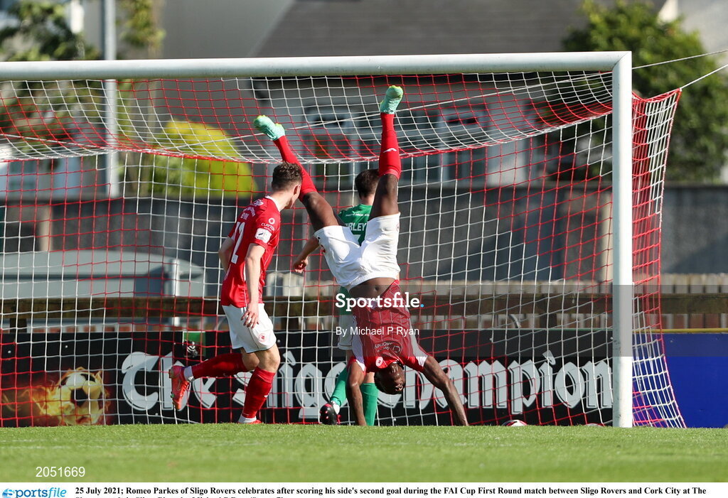 25 July 2021; Romeo Parkes of Sligo Rovers celebrates after scoring his side's second goal during the FAI Cup First Round match between Sligo Rovers and Cork City at The Showgrounds in Sligo. Photo by Michael P Ryan/Sportsfile