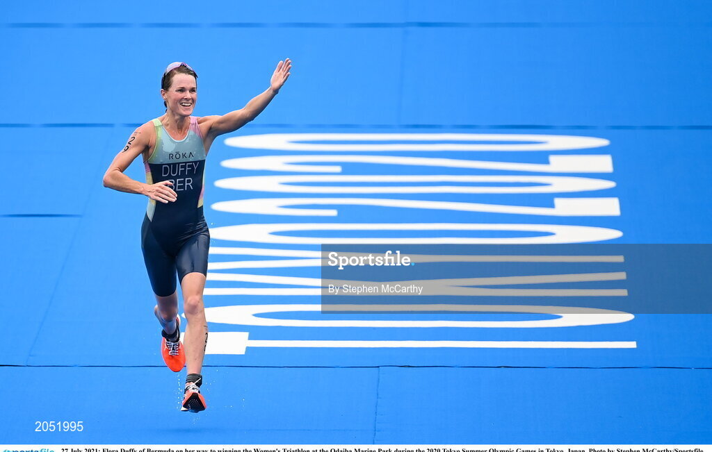 27 July 2021; Flora Duffy of Bermuda on her way to winning the Women's Triathlon at the Odaiba Marine Park during the 2020 Tokyo Summer Olympic Games in Tokyo, Japan. Photo by Stephen McCarthy/Sportsfile