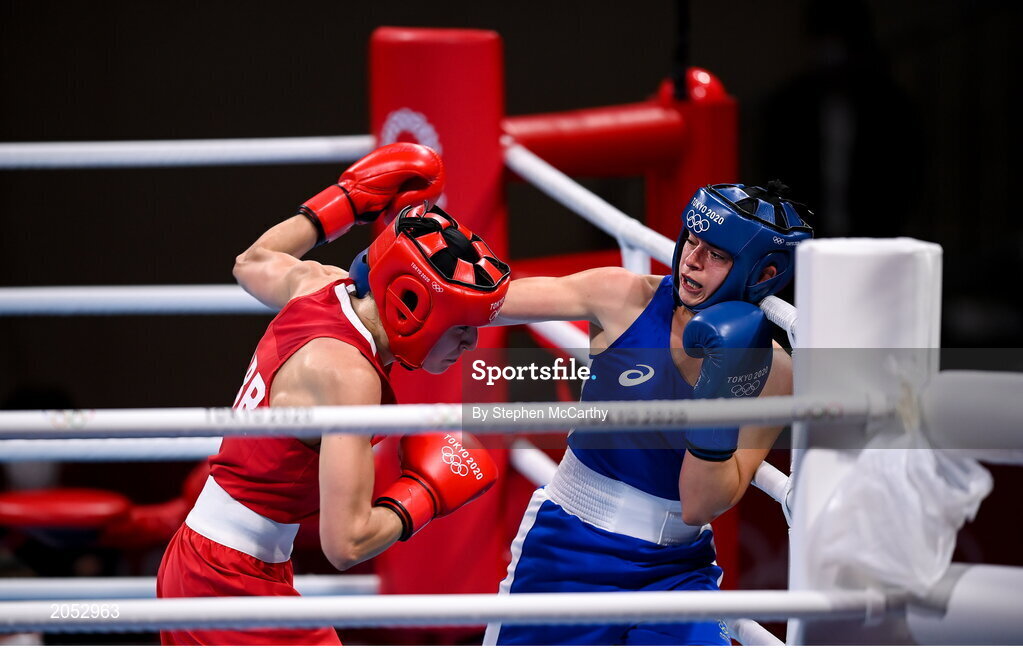 28 July 2021; Karriss Artingstall of Great Britain, left, and Skye Nicolson of Australia during their women's featherweight quarter-final bout at the Kokugikan Arena during the 2020 Tokyo Summer Olympic Games in Tokyo, Japan. Photo by Stephen McCarthy/Sportsfile