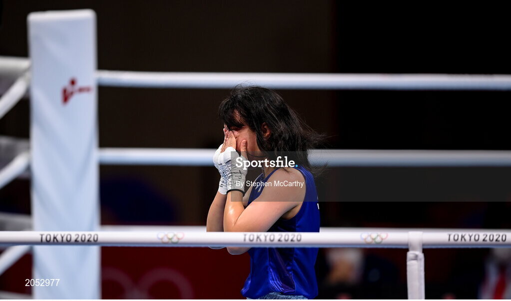 28 July 2021; Sena Irie of Japan after defeating Maria Cluadia Nechita of Romania during their women's featherweight quarter-final bout at the Kokugikan Arena during the 2020 Tokyo Summer Olympic Games in Tokyo, Japan. Photo by Stephen McCarthy/Sportsfile