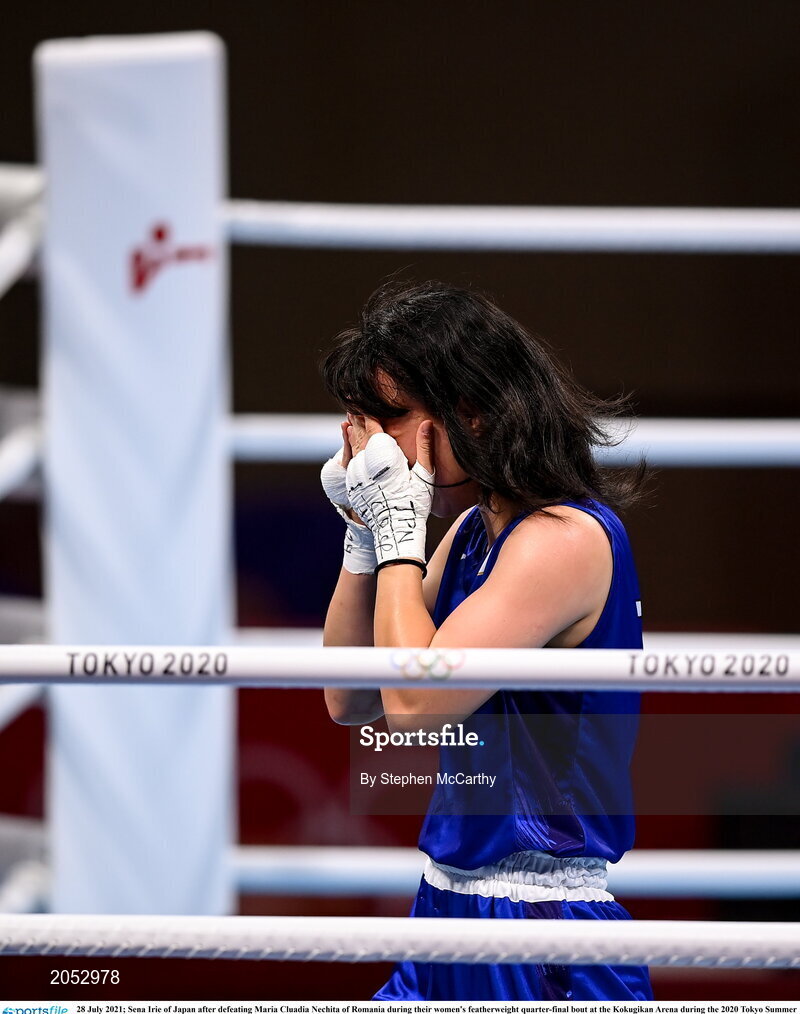 28 July 2021; Sena Irie of Japan after defeating Maria Cluadia Nechita of Romania during their women's featherweight quarter-final bout at the Kokugikan Arena during the 2020 Tokyo Summer Olympic Games in Tokyo, Japan. Photo by Stephen McCarthy/Sportsfile