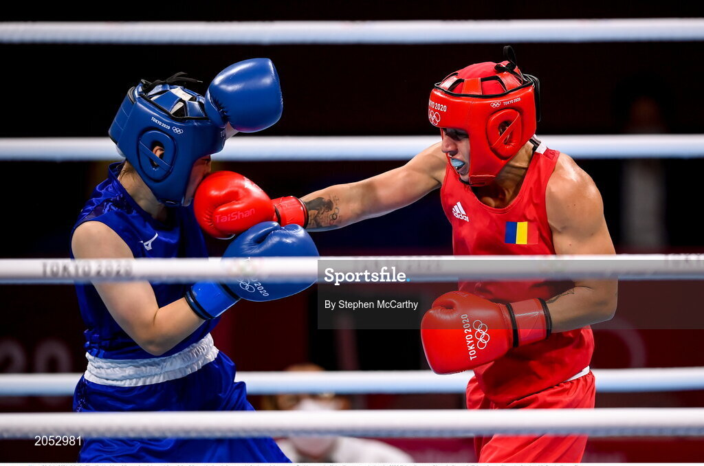28 July 2021; Maria Cluadia Nechita of Romania, right, and Sena Irie of Japan during their women's featherweight quarter-final bout at the Kokugikan Arena during the 2020 Tokyo Summer Olympic Games in Tokyo, Japan. Photo by Stephen McCarthy/Sportsfile
