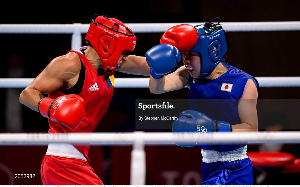 28 July 2021; Maria Cluadia Nechita of Romania, left, and Sena Irie of Japan during their women's featherweight quarter-final bout at the Kokugikan Arena during the 2020 Tokyo Summer Olympic Games in Tokyo, Japan. Photo by Stephen McCarthy/Sportsfile