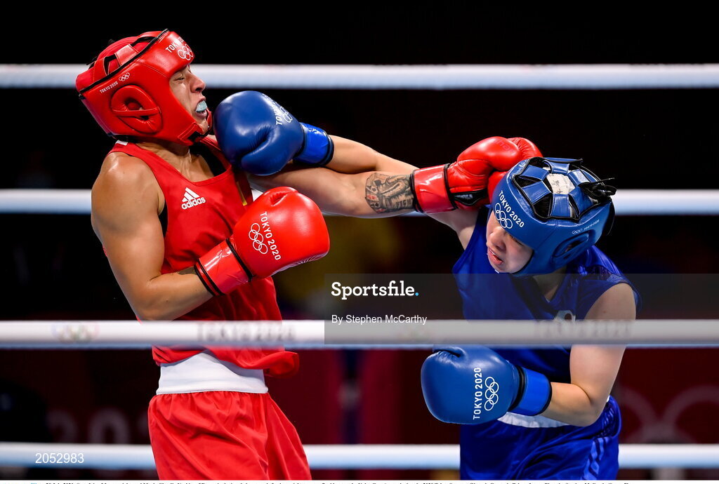 28 July 2021; Sena Irie of Japan, right, and Maria Cluadia Nechita of Romania during their women's featherweight quarter-final bout at the Kokugikan Arena during the 2020 Tokyo Summer Olympic Games in Tokyo, Japan. Photo by Stephen McCarthy/Sportsfile