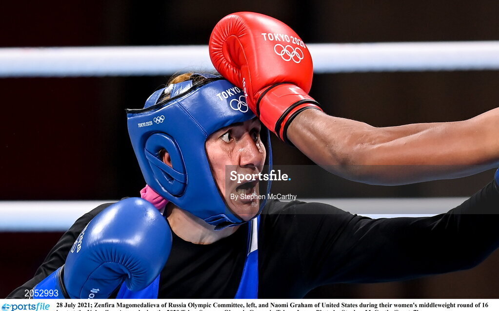 28 July 2021; Zenfira Magomedalieva of Russia Olympic Committee, left, and Naomi Graham of United States during their women's middleweight round of 16 bout at the Kokugikan Arena during the 2020 Tokyo Summer Olympic Games in Tokyo, Japan. Photo by Stephen McCarthy/Sportsfile