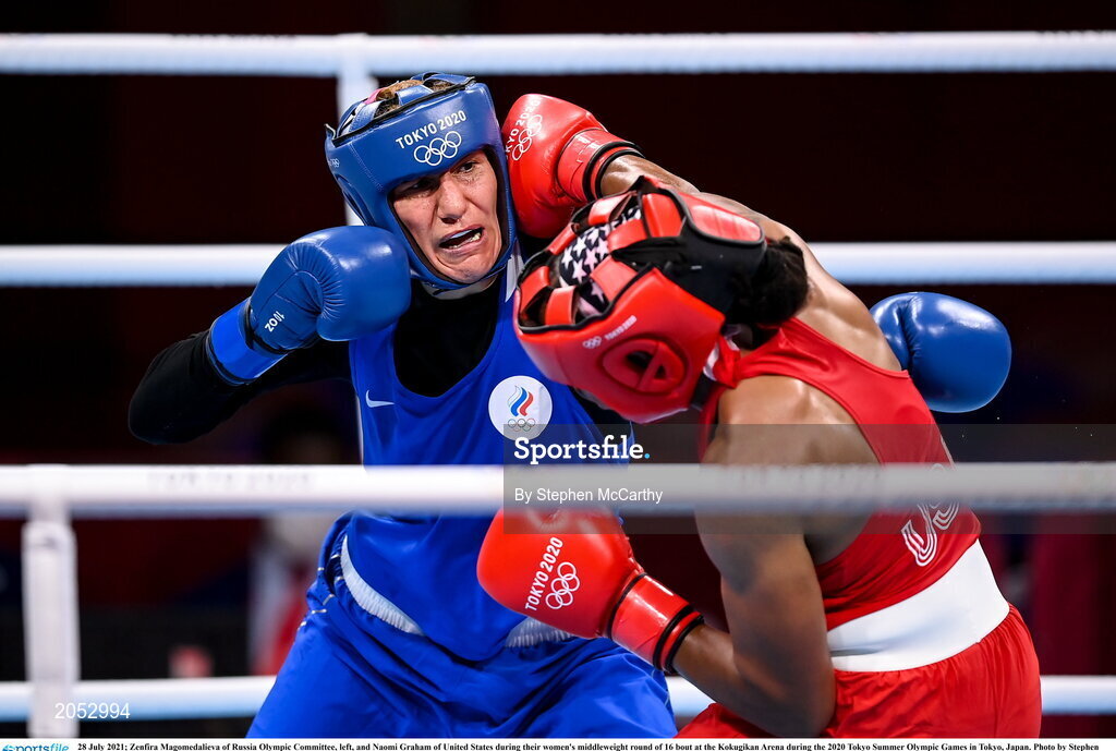 28 July 2021; Zenfira Magomedalieva of Russia Olympic Committee, left, and Naomi Graham of United States during their women's middleweight round of 16 bout at the Kokugikan Arena during the 2020 Tokyo Summer Olympic Games in Tokyo, Japan. Photo by Stephen McCarthy/Sportsfile