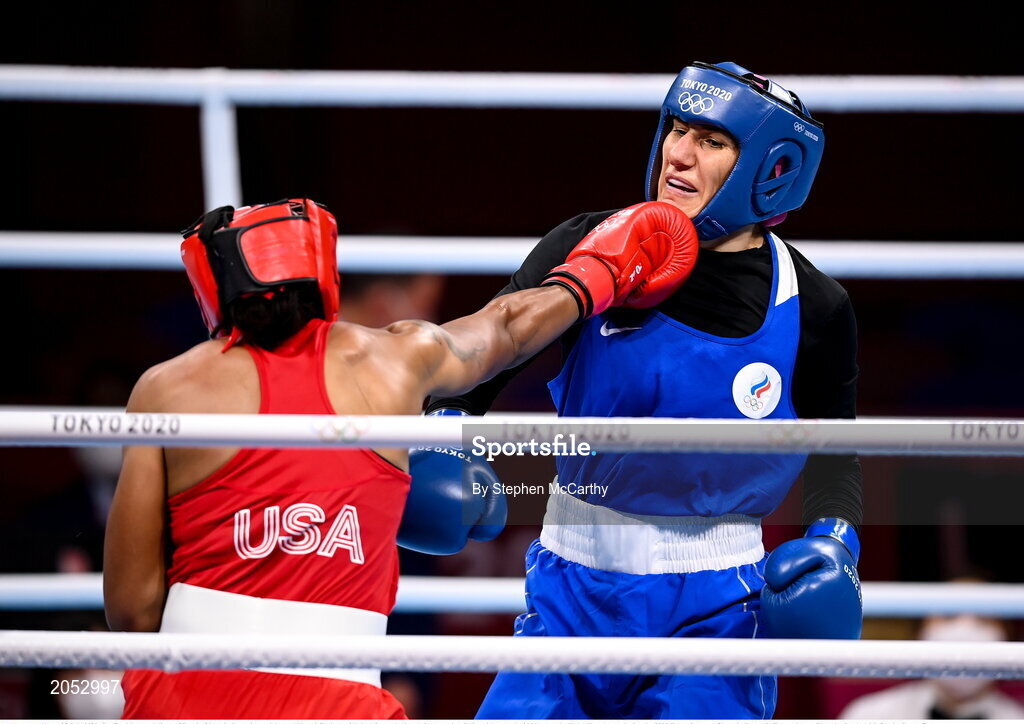 28 July 2021; Zenfira Magomedalieva of Russia Olympic Committee, right, and Naomi Graham of United States during their women's middleweight round of 16 bout at the Kokugikan Arena during the 2020 Tokyo Summer Olympic Games in Tokyo, Japan. Photo by Stephen McCarthy/Sportsfile