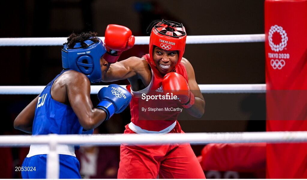28 July 2021; Rady Adosinda Gramane of Mozambique, right, and Erika Stefania Pachito Jurado of Ecuador during their women's middleweight round of 16 bout at the Kokugikan Arena during the 2020 Tokyo Summer Olympic Games in Tokyo, Japan. Photo by Stephen McCarthy/Sportsfile