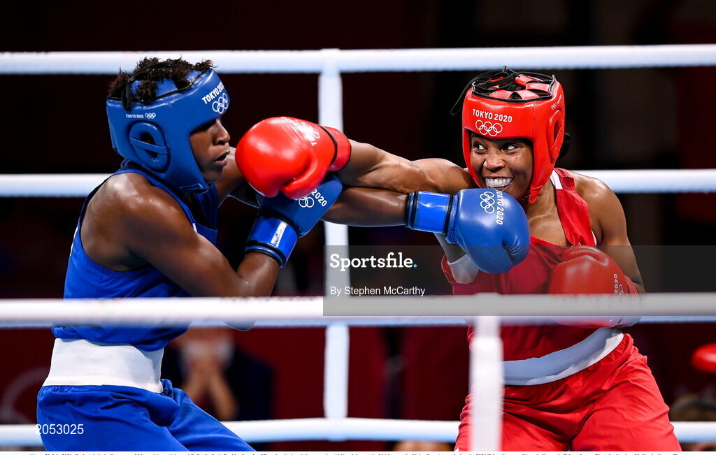 28 July 2021; Rady Adosinda Gramane of Mozambique, right, and Erika Stefania Pachito Jurado of Ecuador during their women's middleweight round of 16 bout at the Kokugikan Arena during the 2020 Tokyo Summer Olympic Games in Tokyo, Japan. Photo by Stephen McCarthy/Sportsfile