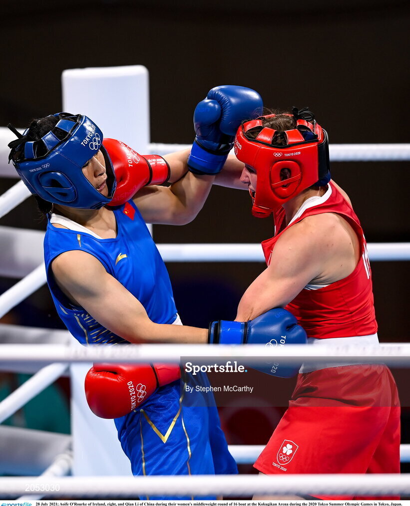 28 July 2021; Aoife O'Rourke of Ireland, right, and Qian Li of China during their women's middleweight round of 16 bout at the Kokugikan Arena during the 2020 Tokyo Summer Olympic Games in Tokyo, Japan. Photo by Stephen McCarthy/Sportsfile
