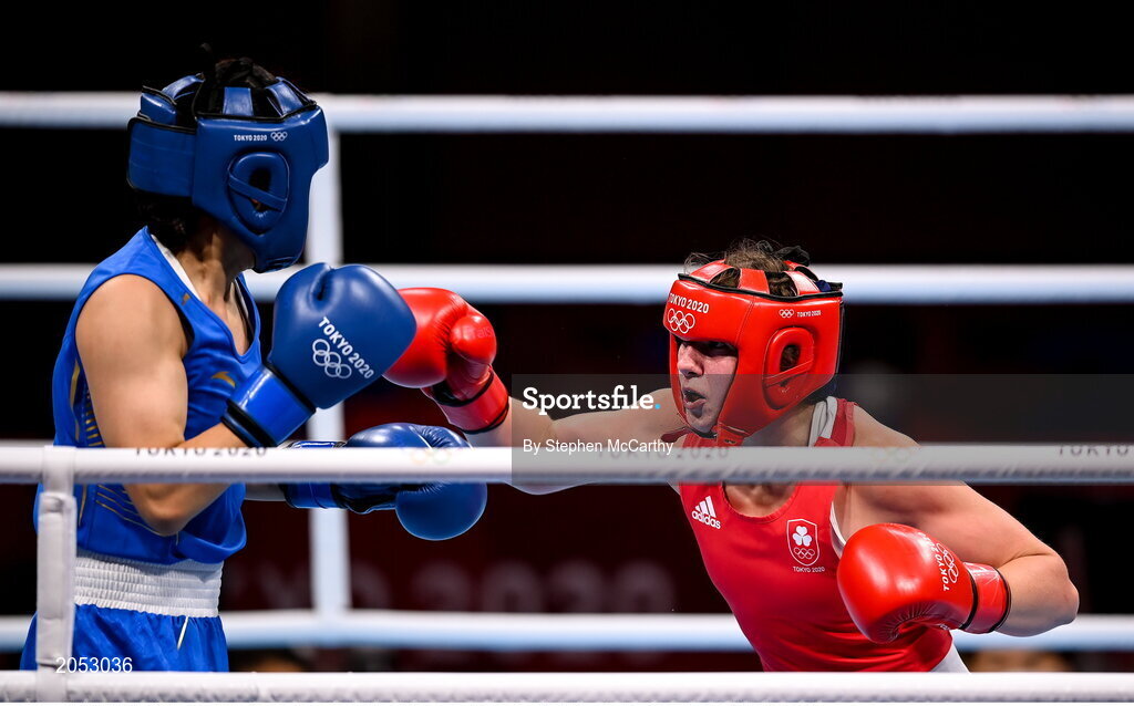 28 July 2021; Aoife O'Rourke of Ireland, right, and Qian Li of China during their women's middleweight round of 16 bout at the Kokugikan Arena during the 2020 Tokyo Summer Olympic Games in Tokyo, Japan. Photo by Stephen McCarthy/Sportsfile
