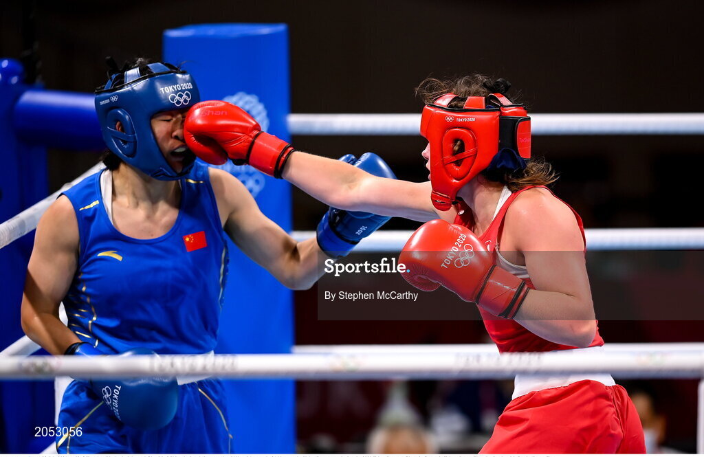 28 July 2021; Aoife O'Rourke of Ireland, right, and Qian Li of China during their women's middleweight round of 16 bout at the Kokugikan Arena during the 2020 Tokyo Summer Olympic Games in Tokyo, Japan. Photo by Stephen McCarthy/Sportsfile