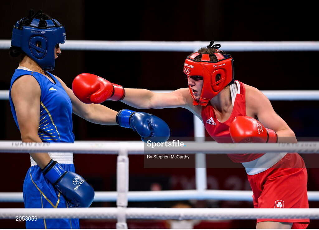 28 July 2021; Aoife O'Rourke of Ireland, right, and Qian Li of China during their women's middleweight round of 16 bout at the Kokugikan Arena during the 2020 Tokyo Summer Olympic Games in Tokyo, Japan. Photo by Stephen McCarthy/Sportsfile