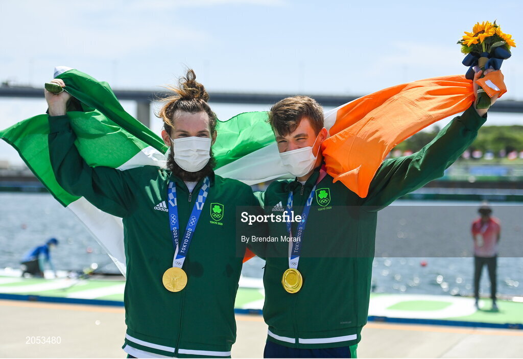 29 July 2021; Paul O'Donovan, left, and Fintan McCarthy of Ireland celebrate with their gold medals after winning the Men's Lightweight Double Sculls final at the Sea Forest Waterway during the 2020 Tokyo Summer Olympic Games in Tokyo, Japan. Photo by Brendan Moran/Sportsfile