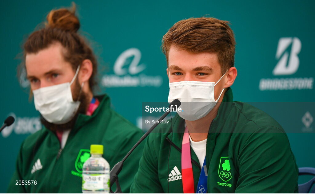 29 July 2021; Fintan McCarthy of Ireland, right, speaking during a media conference after winning gold in the Men's Lightweight Double Sculls, with team-mate Paul O'Donovan, at the Sea Forest Waterway during the 2020 Tokyo Summer Olympic Games in Tokyo, Japan. Photo by Seb Daly/Sportsfile
