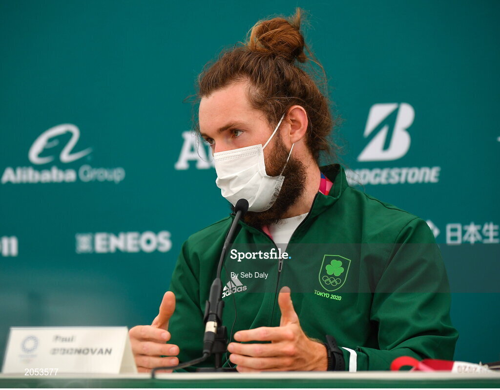 29 July 2021; Paul O'Donovan of Ireland speaking during a media conference after winning gold in the Men's Lightweight Double Sculls, with team-mate Fintan McCarthy, at the Sea Forest Waterway during the 2020 Tokyo Summer Olympic Games in Tokyo, Japan. Photo by Seb Daly/Sportsfile