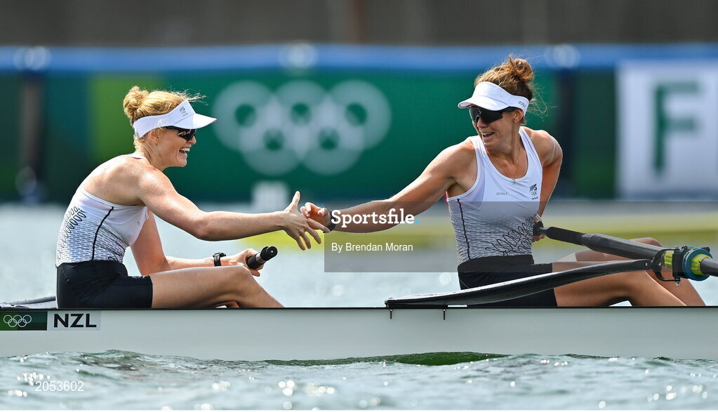 29 July 2021; Grace Prendergast, left, and Kerri Gowler of New Zealand celebrate after winning gold in the Women's Pair final at the Sea Forest Waterway during the 2020 Tokyo Summer Olympic Games in Tokyo, Japan. Photo by Brendan Moran/Sportsfile